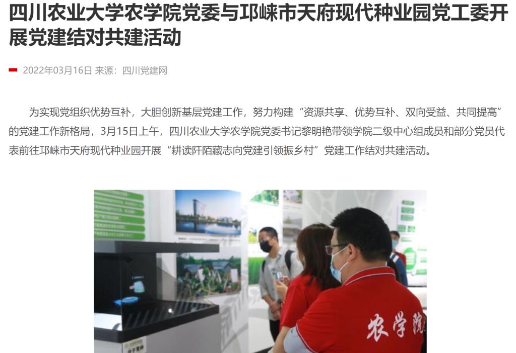 为实现党组织优势互补,大胆创新基层党建工作,努力构建“资源共享、优势互补、双向受益、共同提高”的党建工作新格局,3月15日上午,36365线路检测中心no1党委书记黎明艳带领学院二级中心组成员和部分党员代表前往邛崃市天府现代种业园开展“耕读阡陌藏志向党建引领振乡村”党建工作结对共建活动。