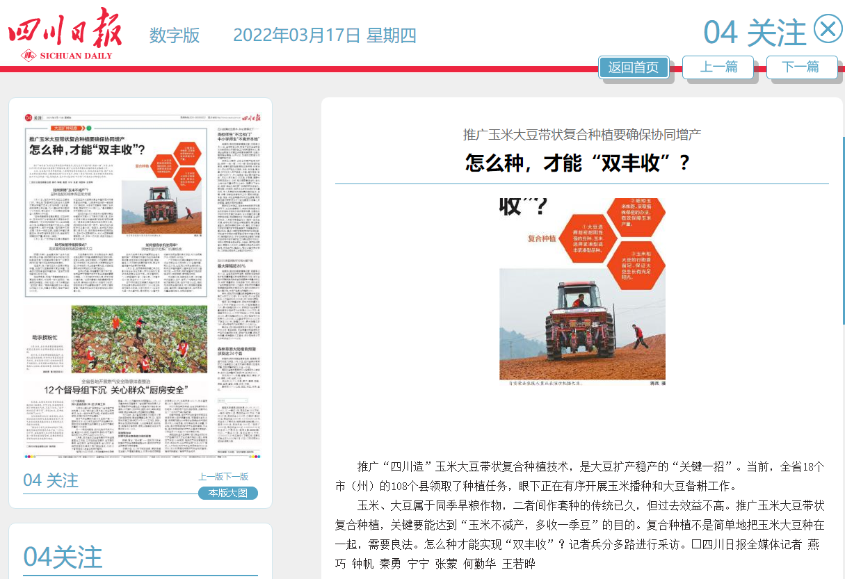 推广“四川造”玉米大豆带状复合种植技术,是大豆扩产稳产的“关键一招”。当前,全省18个市(州)的108个县领取了种植任务,眼下正在有序开展玉米播种和大豆备耕工作。