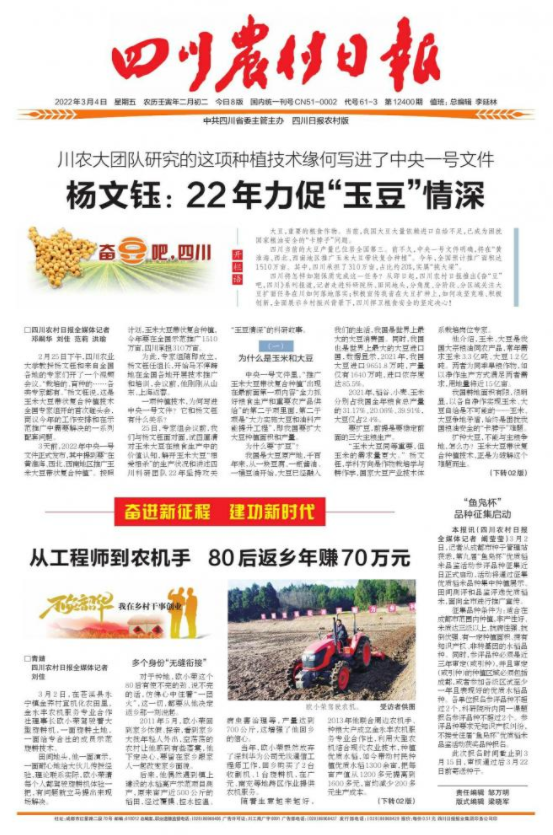 四川将怎样如期保质完成这一任务?从即日起,四川农村日报推出《奋“豆”吧,四川》系列报道,记者走进科研院所、田间地头,分角度、分阶段、分区域关注大豆扩面任务在川如何落地落实;积极宣传我省在大豆扩种上,如何攻坚克难、积极创新,全面展示乡村振兴背景下,四川捍卫粮食安全的坚定决心!