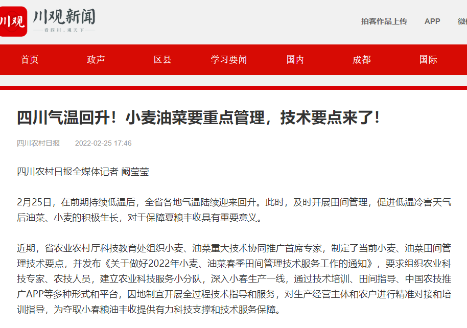 2022年,我省小麦遭遇了播种期间的严重湿害,部分晚播渍害麦田苗情偏弱。进入2月以来,盆地气温持续偏低,降水偏多,日照时数不足。