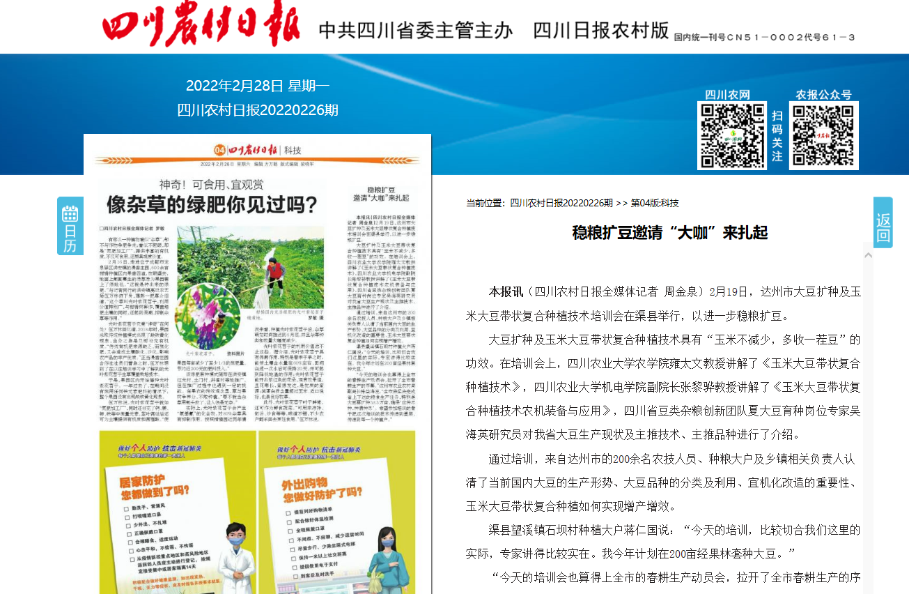 2月19日,达州市大豆扩种及玉米大豆带状复合种植技术培训会在渠县举行,以进一步稳粮扩豆。