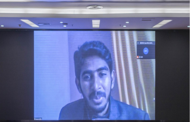 图为留学生Sajad Hussain(贾德·侯赛因)以线上交流的方式作分享