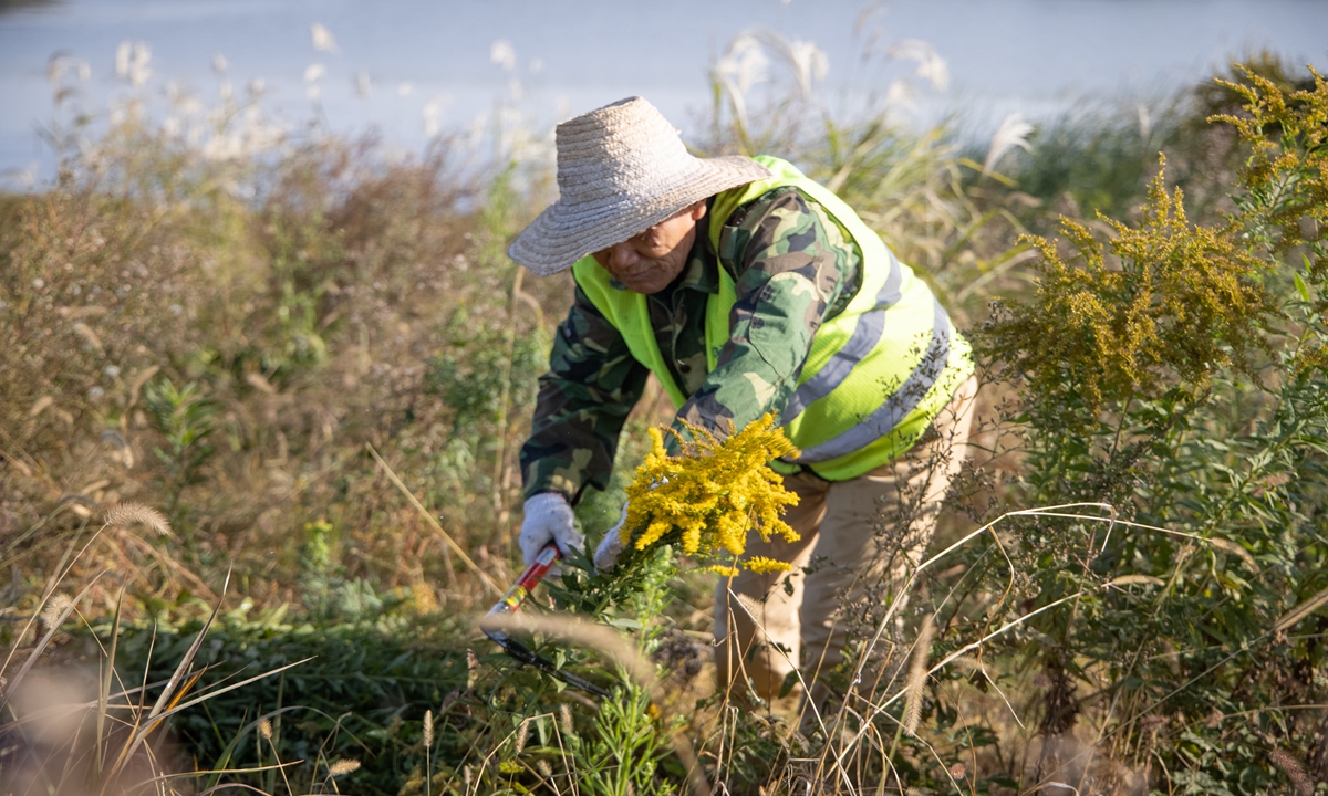 一名男子在中国中部地区的湖北省武汉市消灭加拿大一枝黄花。照片:VCG