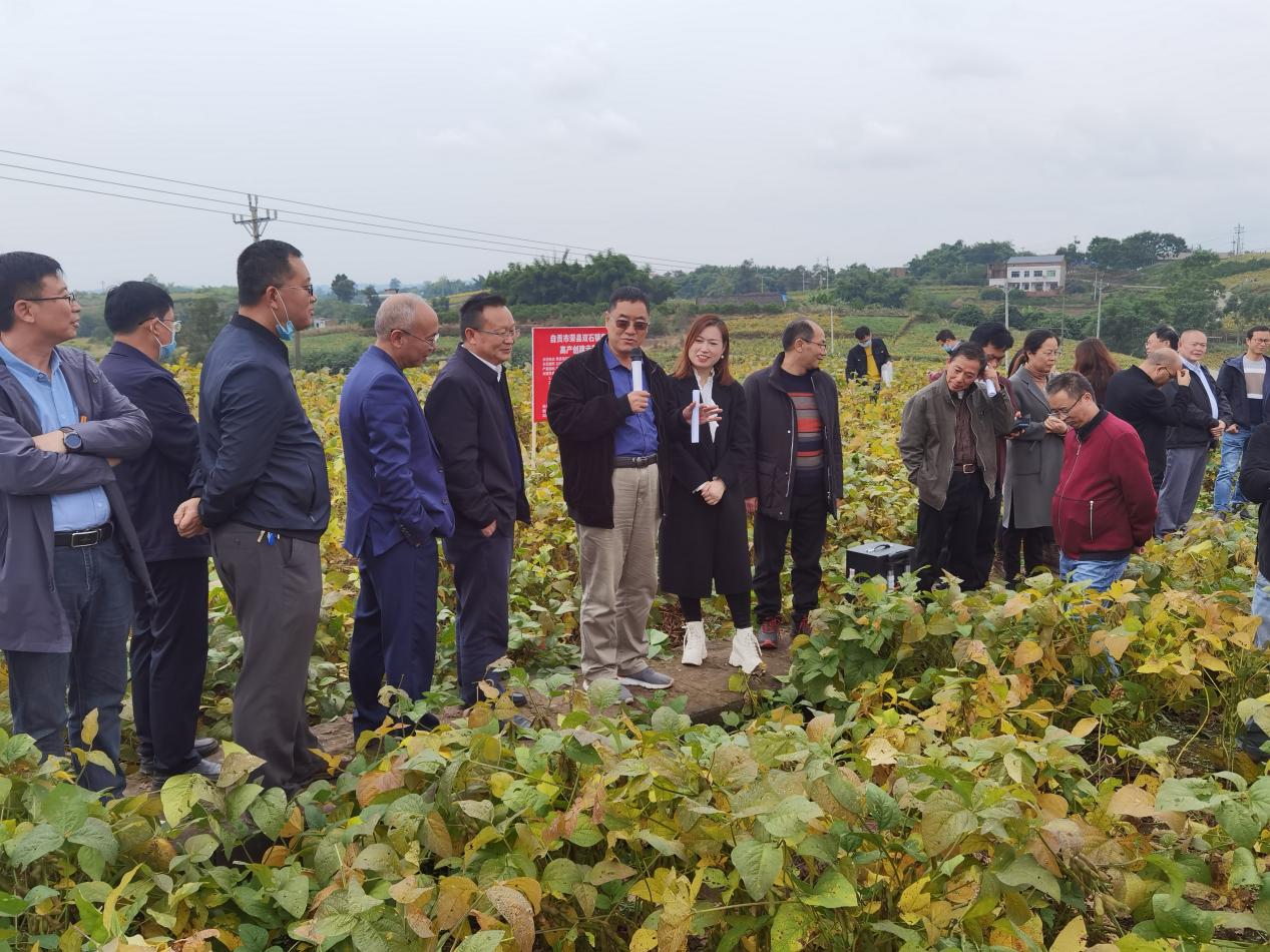在自贡市荣县、贡井区万亩带状套作大豆高产示范带,荣县种植业服务中心副主任邓榆千和贡井区农技站副站长王娟分别对前来观摩的参会代表介绍了荣县和贡井区的大豆带状复合种植高产示范情况,该区域在引进玉米大豆带状复合种植技术后,结合省协同推广计划试点项目,通过省、市、县(区)多级科研与推广部门的共同努力,大大提高了技术到位率,使玉米(高粱)大豆带状复合种植面积占到净作玉米(高粱)面积的85%,漫山遍野的大豆成为当前秋粮生产的主导产业和农业靓点。