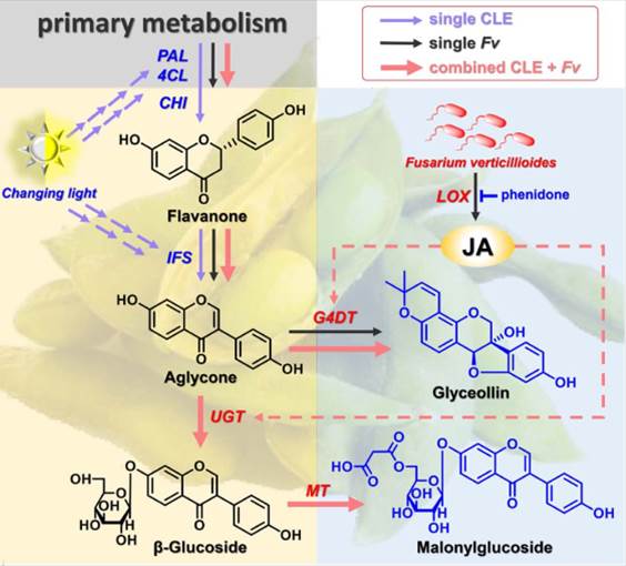 Fusarium verticillioides等田间真菌病害导致大豆品质低劣、产量降低,是南方大豆生产的重要瓶颈。种荚是豆科植物抵御外界环境胁迫的第一道防线,对大豆田间霉变具有积极的防御作用。玉米-大豆带状复合种植模式下,大豆种荚霉变发生率显著降低,但其原因尚不清楚。同时玉米-大豆套作变光环境能促进大豆籽粒中异黄酮的合成积累(Food Chem, 2016, 207: 107-114)。本研究通过多年的田间模拟试验,探究了不同生育时期遮荫条件下,大豆种荚霉变抗性及代谢群体的变化规律;证实了变光环境,特别是“营养生长期荫蔽-生殖生长期复光”处理能显著提高大豆豆荚的霉变抗性。代谢组学分析和外源茉莉酸及其合成抑制剂处理试验,进一步揭示了变光环境与豆荚内源茉莉酸对异黄酮合成及霉变抗性具有协同提升作用。变光环境通过促进豆荚中异黄酮合成通路上游组成型异黄酮苷元和葡萄糖苷的积累,为下游诱导型异黄酮(丙二酰基化异黄酮、大豆抗毒素)合成提供了充足前体物;当豆荚遭受霉菌侵染时,其茉莉酸信号通路启动,并进一步促进了诱导型异黄酮的合成,从而协同提高了豆荚的霉变抗性。