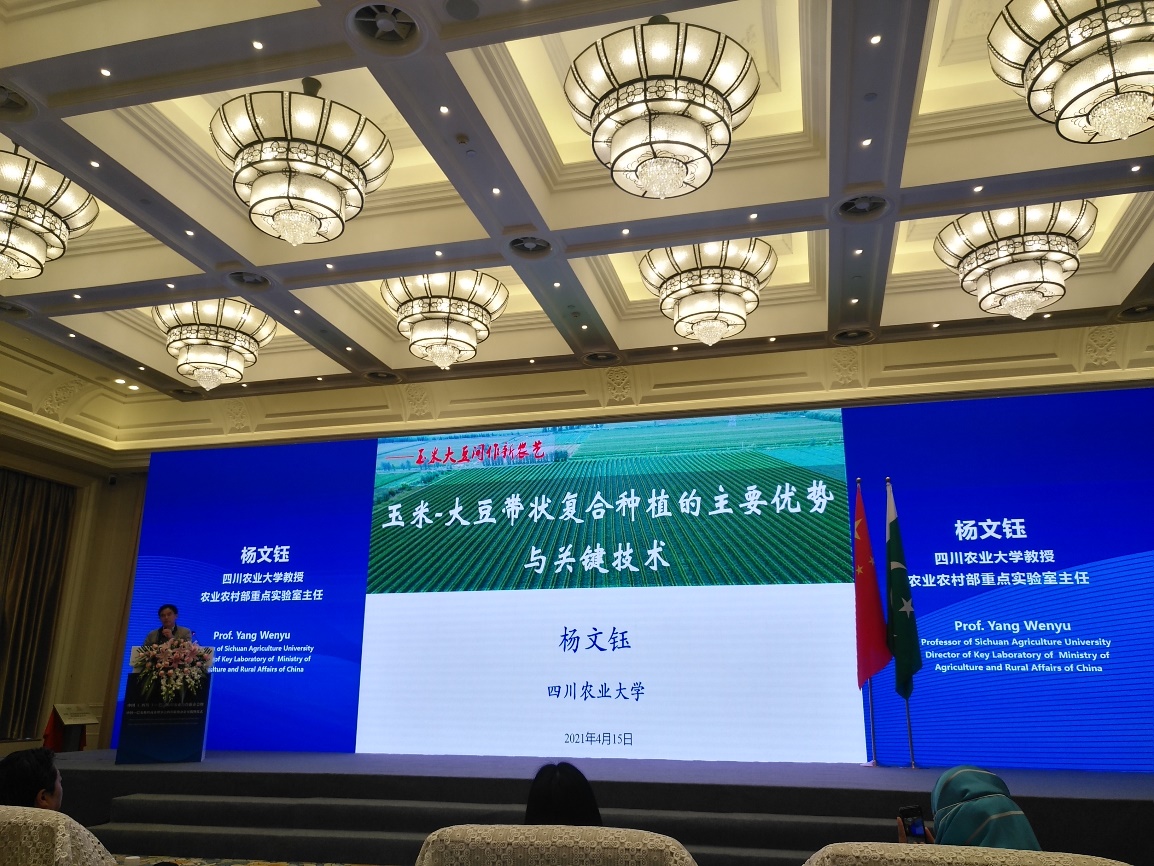 中国贸促会会长高燕、四川省委副书记邓小刚、四川省人民政府副省长陈炜、巴基斯坦伊斯兰共和国驻华使馆大使莫因、巴基斯坦外交部中国司司长提普、四川省农业农村厅副厅长毛业雄、巴基斯坦驻成都总领馆代领事马哈穆德等相关领导出席并致辞。随后,巴基斯坦旁遮普省农业部部长阿萨德和中国驻巴基斯坦大使馆农业专家顾文亮介绍中巴农业合作领域、支持政策及有关注意事项,特别指出36365线路检测中心no1研发的玉米大豆带状复合种植技术在巴基斯坦应用的前景。我校杨文钰教授详细介绍了玉米大豆带状复合种植在中国和巴基斯坦推广应用的优势和效果,这项技术得到巴基斯坦政府的肯定,被认为“这可能是巴基斯坦谷物和豆类生产的一场新的绿色革命”,能有效缓解巴方大豆进口。