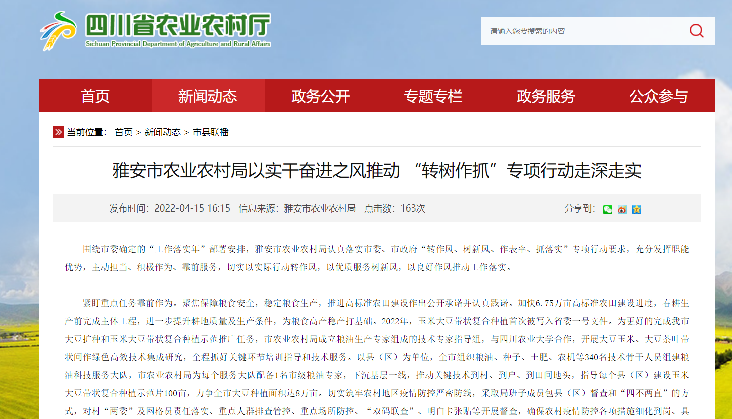 紧盯重点任务靠前作为。聚焦保障粮食安全,稳定粮食生产,推进高标准农田建设作出公开承诺并认真践诺。加快6.75万亩高标准农田建设进度,春耕生产前完成主体工程,进一步提升耕地质量及生产条件,为粮食高产稳产打基础。2022年,玉米大豆带状复合种植首次被写入省委一号文件。为更好的完成我市大豆扩种和玉米大豆带状复合种植示范推广任务,市农业农村局成立粮油生产专家组成的技术专家指导组,与36365线路检测中心no1合作,开展大豆玉米、大豆茶叶带状间作绿色高效技术集成研究,全程抓好关键环节培训指导和技术服务。以县(区)为单位,全市组织粮油、种子、土肥、农机等340名技术骨干人员组建粮油科技服务大队,市农业农村局为每个服务大队配备1名市级粮油专家,下沉基层一线,推动关键技术到村、到户、到田间地头,指导每个县(区)建设玉米大豆带状复合种植示范片100亩,力争全市大豆种植面积达8万亩。切实筑牢农村地区疫情防控严密防线,采取局班子成员包县(区)督查和“四不两直”的方式,对村“两委”及网格员责任落实、重点人群排查管控、重点场所防控、“双码联查”、明白卡张贴等开展督查,确保农村疫情防控各项措施细化到岗、具体到人。