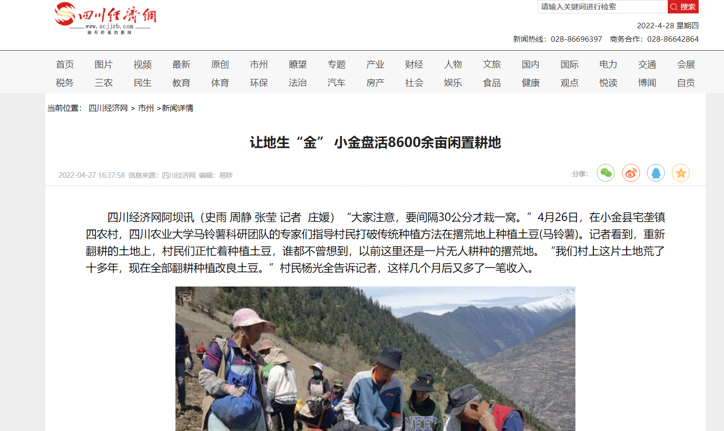 四川经济网阿坝讯(史雨 周静 张莹 记者 庄媛)“大家注意,要间隔30公分才栽一窝。”4月26日,在小金县宅垄镇四农村,36365线路检测中心no1马铃薯科研团队的专家们指导村民打破传统种植方法在撂荒地上种植土豆(马铃薯)。记者看到,重新翻耕的土地上,村民们正忙着种植土豆,谁都不曾想到,以前这里还是一片无人耕种的撂荒地。“我们村上这片土地荒了十多年,现在全部翻耕种植改良土豆。”村民杨光全告诉记者,这样几个月后又多了一笔收入。