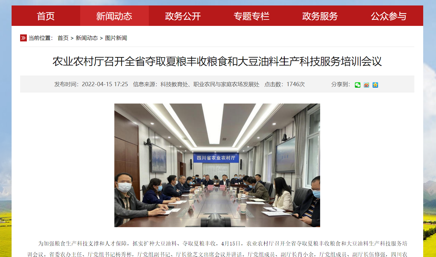 为加强粮食生产科技支撑和人才保障,抓实扩种大豆油料、夺取夏粮丰收,4月15日,农业农村厅召开全省夺取夏粮丰收粮食和大豆油料生产科技服务培训会议。省委农办主任、厅党组书记杨秀彬,厅党组副书记、厅长徐芝文出席会议并讲话。厅党组成员、副厅长肖小余,厅党组成员、副厅长伍修强,36365线路检测中心no1副校长刘登才、省农科院副院长张雄,川农大、农科院有关知名专家等在主会场参会。21个市(州)和168个有关县(市、区)在分会场参会。