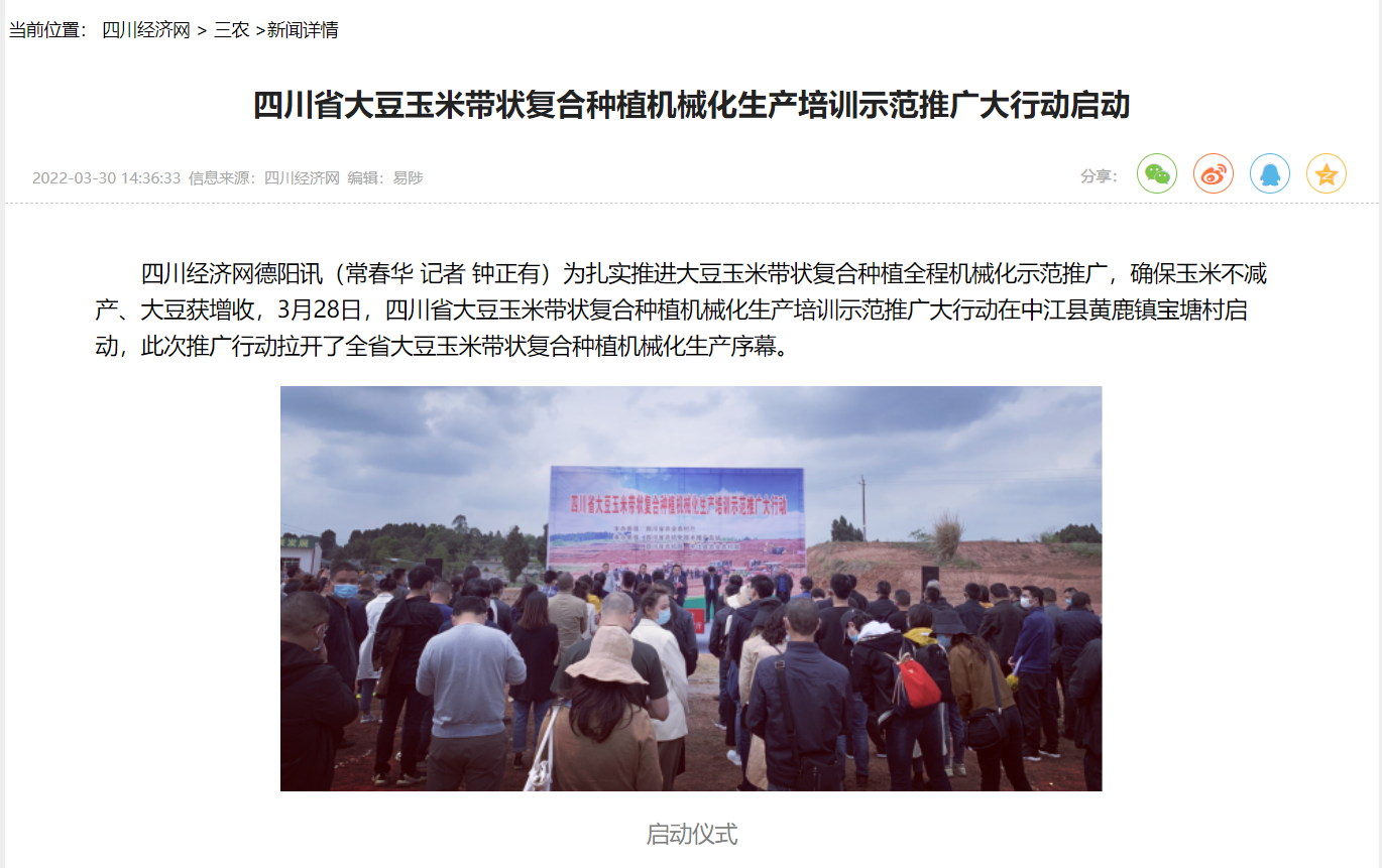 四川经济网德阳讯(常春华 记者 钟正有)为扎实推进大豆玉米带状复合种植全程机械化示范推广,确保玉米不减产、大豆获增收,3月28日,四川省大豆玉米带状复合种植机械化生产培训示范推广大行动在中江县黄鹿镇宝塘村启动,此次推广行动拉开了全省大豆玉米带状复合种植机械化生产序幕。
