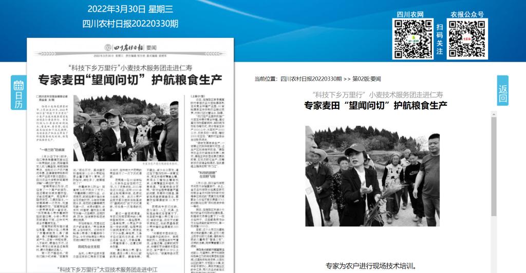 恰逢小麦扬花灌浆时节,3月28至29日,2022年四川省“科技下乡万里行”小麦产业技术服务团首发活动在仁寿县举行。专家们深入仁寿县的田间地头,看麦田、看长势,通过技术培训和下沉式调研,为该县农户和业主带来了科技服务的及时雨,保驾护航粮食生产。