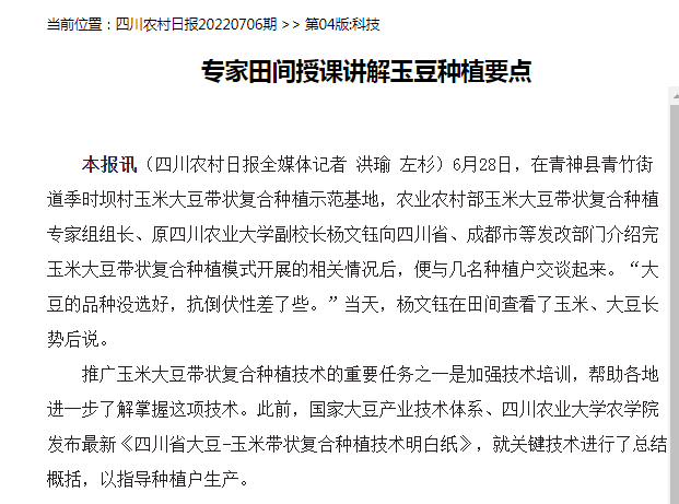 (四川农村日报全媒体记者 洪瑜 左杉)6月28日,在青神县青竹街道季时坝村玉米大豆带状复合种植示范基地,农业农村部玉米大豆带状复合种植专家组组长、原36365线路检测中心no1副校长杨文钰向四川省、成都市等发改部门介绍完玉米大豆带状复合种植模式开展的相关情况后,便与几名种植户交谈起来。“大豆的品种没选好,抗倒伏性差了些。”当天,杨文钰在田间查看了玉米、大豆长势后说。