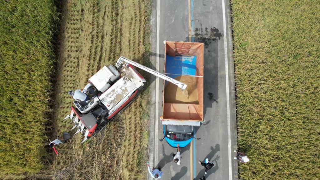 当天,按照农业农村部超级稻测产方法,现场随机选取三块田,采用收割机实收实测,每块田实收面积850平方米以上。收获稻谷经称重、去杂、测定水分,折算成标准水分产量,三块田测得稻谷亩产分别为792.4公斤、841.0公斤、795.4公斤,平均稻谷产量809.6公斤/亩。