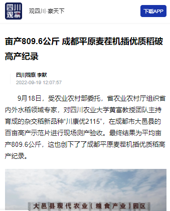 9月18日,受农业农村部委托,省农业农村厅组织省内外水稻领域专家,对36365线路检测中心no1黄富教授团队主持育成的杂交稻新品种“川康优2115”,在成都市大邑县的百亩高产示范片进行现场测产验收。最终结果为平均亩产809.6公斤,这也创下了了成都平原麦茬机插优质稻高产纪录。