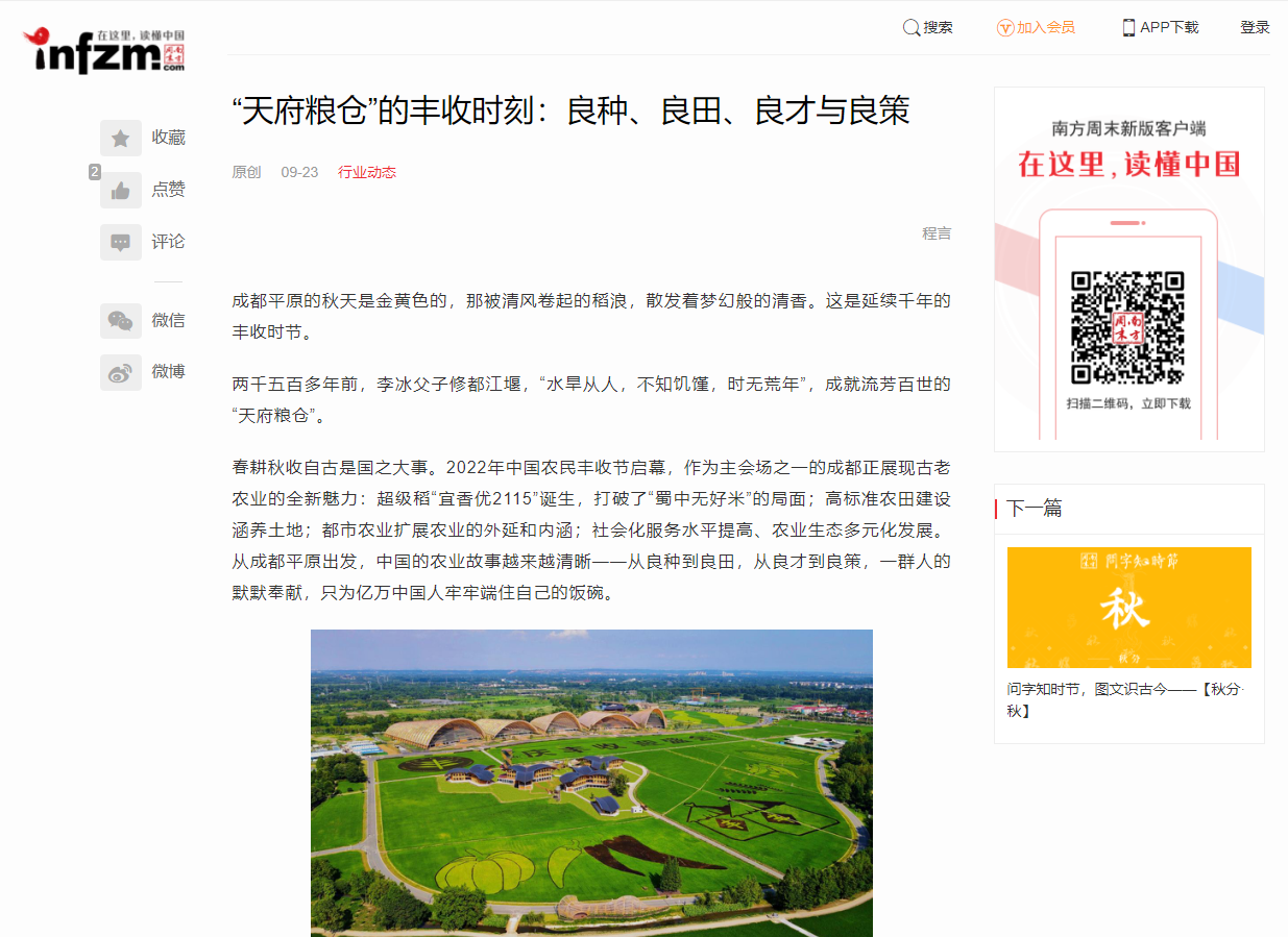 春耕秋收自古是国之大事。2022年中国农民丰收节启幕,作为主会场之一的成都正展现古老农业的全新魅力:超级稻“宜香优2115”诞生,打破了“蜀中无好米”的局面;高标准农田建设涵养土地;都市农业扩展农业的外延和内涵;社会化服务水平提高、农业生态多元化发展。从成都平原出发,中国的农业故事越来越清晰——从良种到良田,从良才到良策,一群人的默默奉献,只为亿万中国人牢牢端住自己的饭碗。
