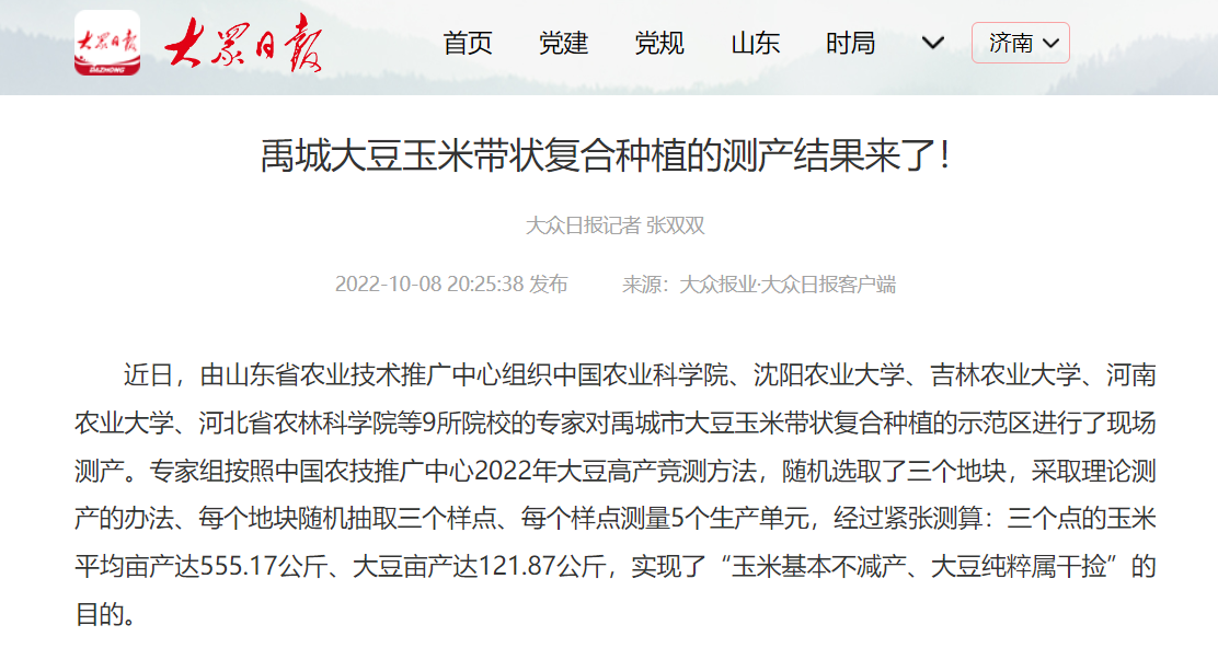 近日,由山东省农业技术推广中心组织中国农业科学院、沈阳农业大学、吉林农业大学、河南农业大学、河北省农林科学院等9所院校的专家对禹城市大豆玉米带状复合种植的示范区进行了现场测产。专家组按照中国农技推广中心2022年大豆高产竞测方法,随机选取了三个地块,采取理论测产的办法、每个地块随机抽取三个样点、每个样点测量5个生产单元,经过紧张测算:三个点的玉米平均亩产达555.17公斤、大豆亩产达121.87公斤,实现了“玉米基本不减产、大豆纯粹属干捡”的目的。