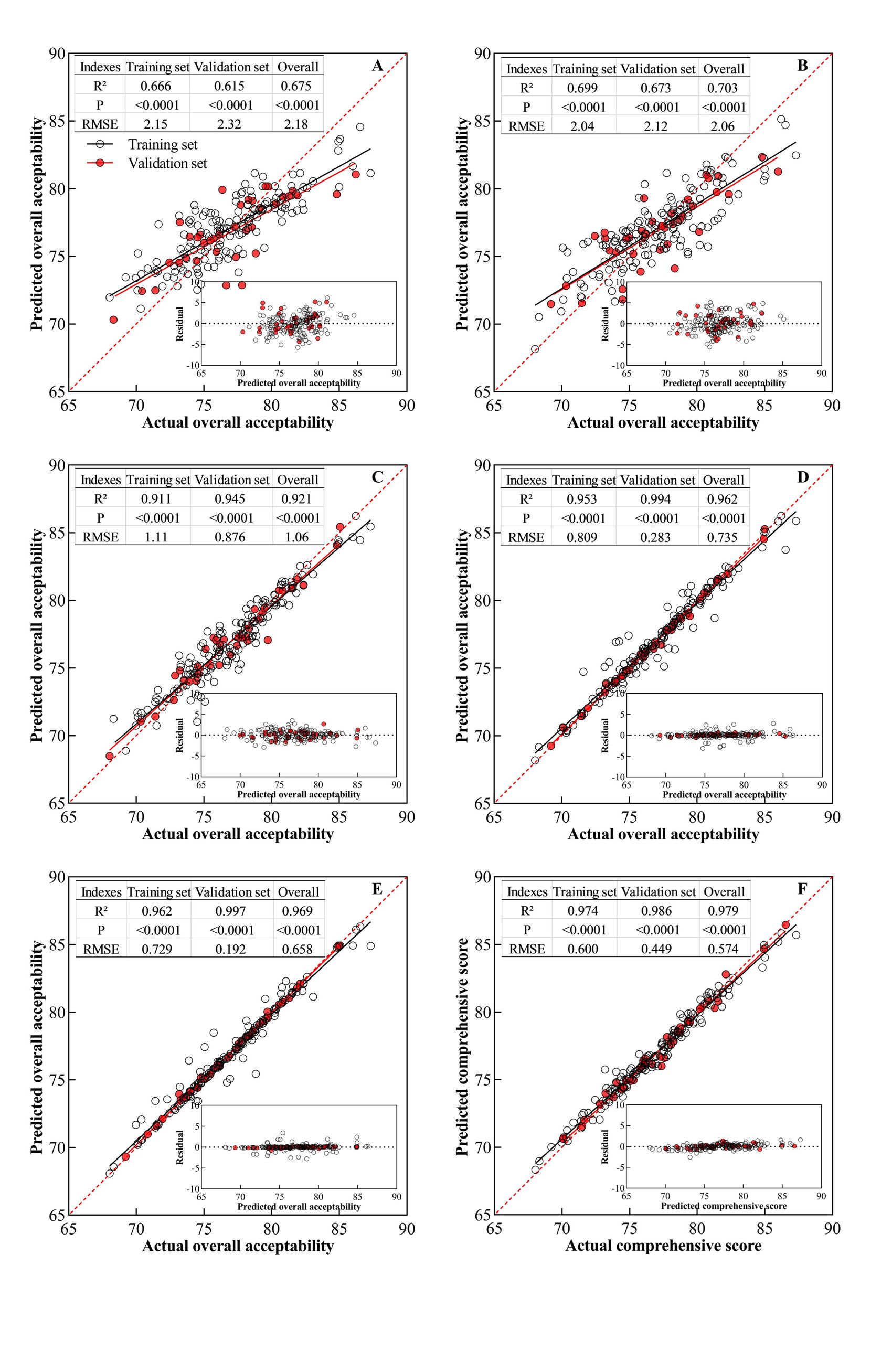 近年来,任万军教授团队收集了四川、云南、贵州种植的186份机插杂交籼稻材料,在进行人工百分制感官评价的基础上,进一步测定了材料直链淀粉、蛋白质和脂肪含量,淀粉RVA谱特性,米饭质构特性等理化指标,并利用多种传统数学统计方法,以及人工神经网络等机器学习方法,构建了机插杂交籼稻食味综合评分的预测模型。