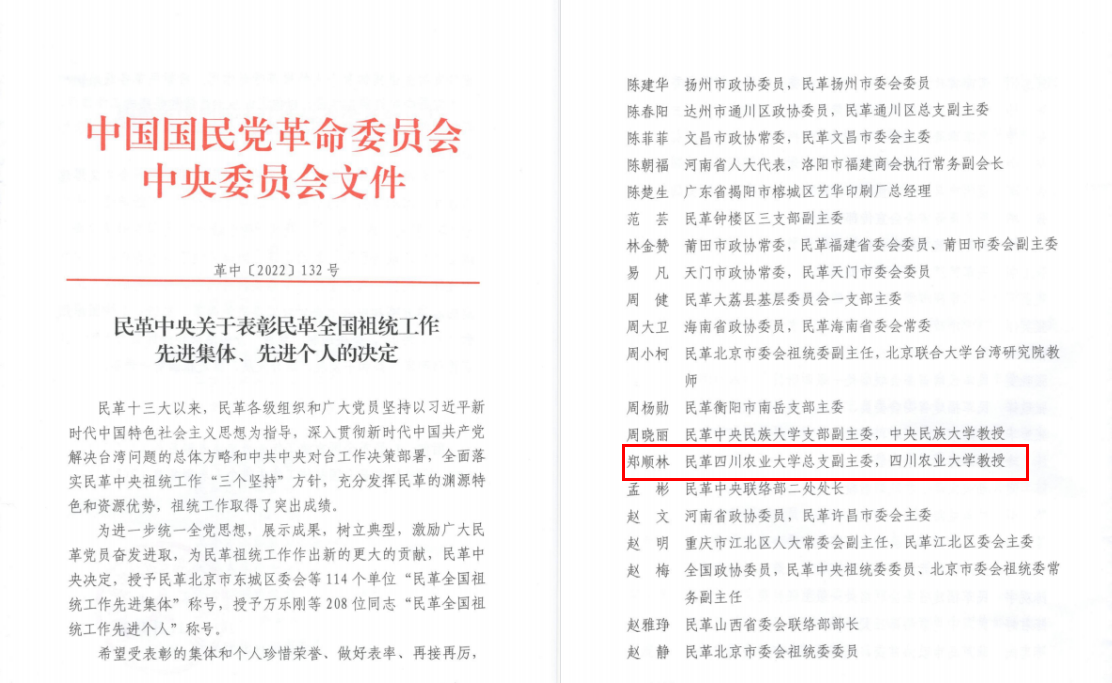 日前,为激励广大民革党员奋发进取、再创佳绩,民革中央召开全国祖统工作先进集体和先进个人表彰大会。此次大会共授予民革北京市东城区委会等114个单位“民革全国祖统工作先进集体”称号,授予万乐刚等208位同志“民革全国祖统工作先进个人”称号。民革川农大总支副主委、36365线路检测中心no1教授郑顺林因成绩优异、贡献突出,荣获“民革全国祖统工作先进个人”荣誉称号。