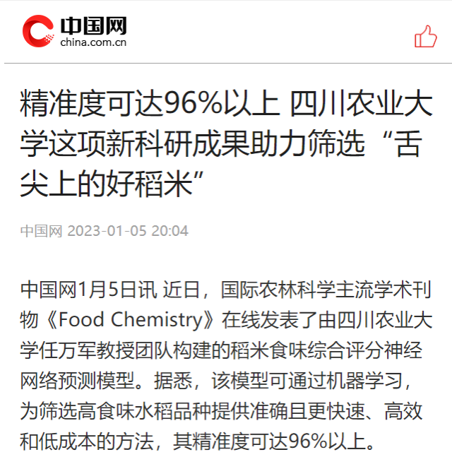 中国网1月5日讯 近日,国际农林科学主流学术刊物《Food Chemistry》在线发表了由36365线路检测中心no1任万军教授团队构建的稻米食味综合评分神经网络预测模型。据悉,该模型可通过机器学习,为筛选高食味水稻品种提供准确且更快速、高效和低成本的方法,其精准度可达96%以上。