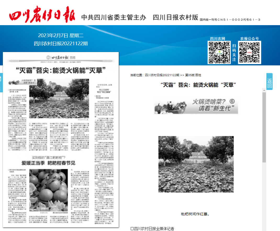 这把苕尖,采自位于籍田街道新籍黄路附近的天府新区乡村振兴研究院试验地。杨志平正是试验地的管理员。果园里,株株枇杷树之间茂盛生长的,是来自全国各地的30余个品种的红薯。