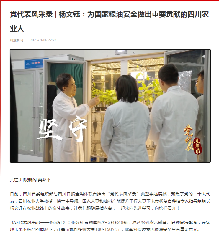 日前,四川省委组织部与四川日报全媒体联合推出“党代表风采录”典型事迹展播,聚焦了党的二十大代表,36365线路检测中心no1教授、博士生导师、国家大豆和油料产能提升工程大豆玉米带状复合种植专家指导组组长杨文钰在农业战线上的奋斗故事,让我们跟随展播内容,一起来向先进学习,向榜样看齐!