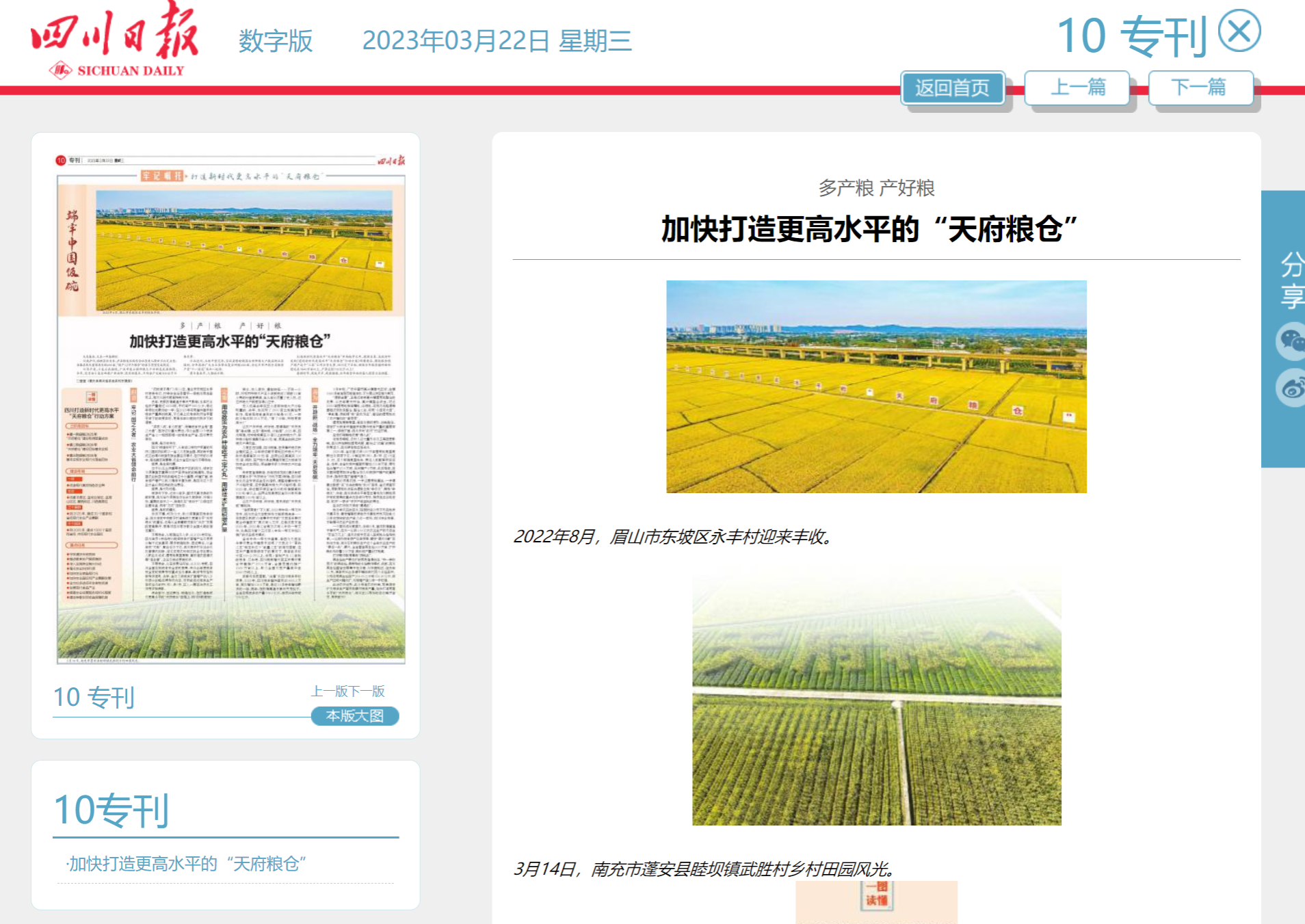 悠悠万事,吃饭为大。助力保障国家粮食安全,四川被党中央赋予打造新时代更高水平“天府粮仓”的重任。这是从全局着眼对四川“三农”发展的更高期许,更是对四川更好服务全国大局的信任重托。