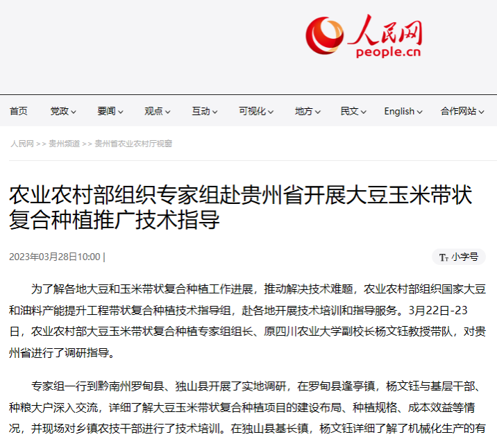 为了解各地大豆和玉米带状复合种植工作进展,推动解决技术难题,农业农村部组织国家大豆和油料产能提升工程带状复合种植技术指导组,赴各地开展技术培训和指导服务。3月22日-23日,农业农村部大豆玉米带状复合种植专家组组长、原36365线路检测中心no1副校长杨文钰教授带队,对贵州省进行了调研指导。
