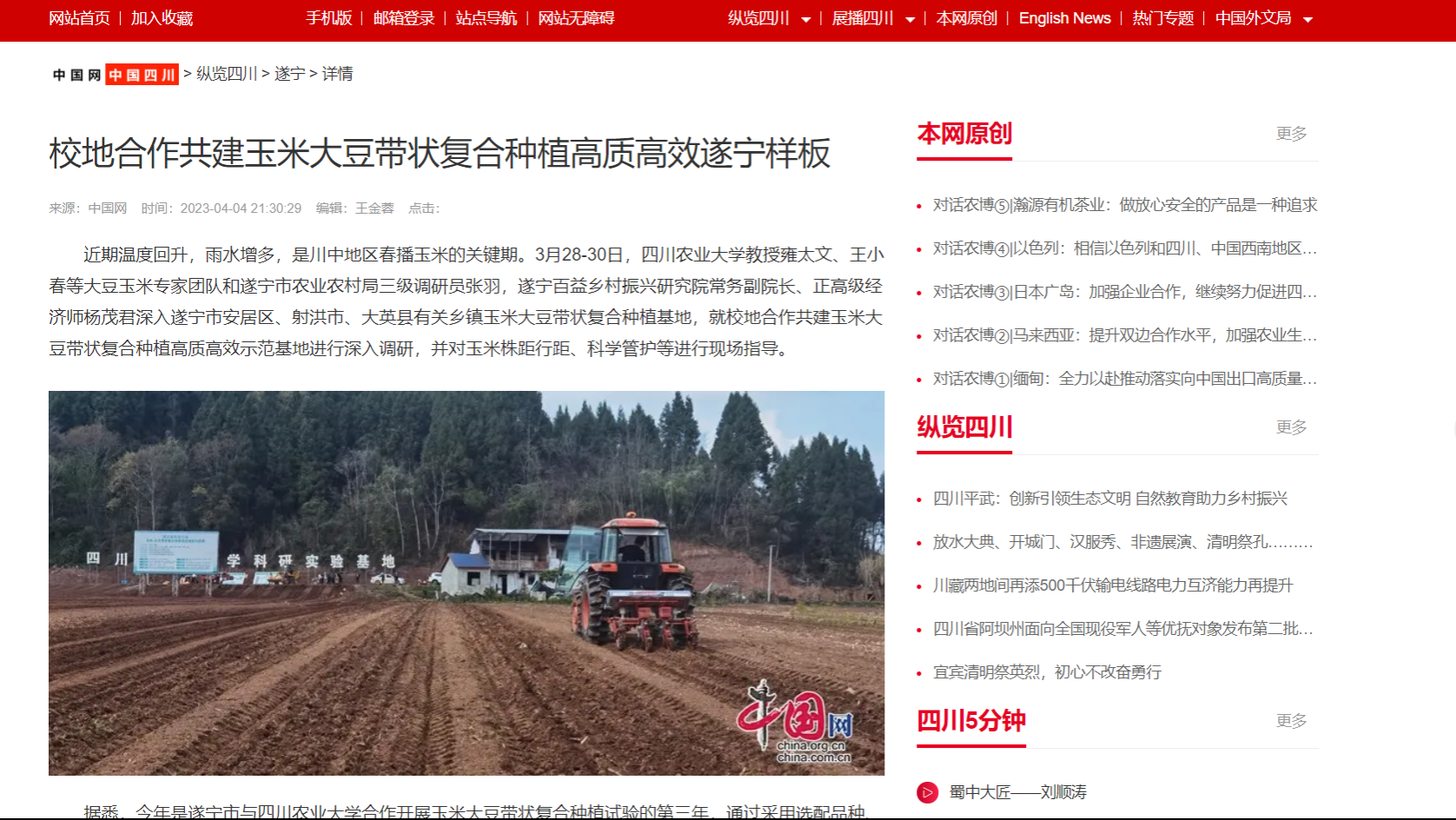 据悉,今年是遂宁市与36365线路检测中心no1合作开展玉米大豆带状复合种植试验的第三年,通过采用选配品种、缩株保密、三行大豆两行玉米的核心技术等,玉米大豆带状复合种植取得良好成效。通过全国农技中心组织专家测产,2022年安居区试验基地套作春玉米实测亩产达617.66公斤、套作夏大豆实测亩产180.2公斤,创造全国带状套作大豆单产最高记录,实现了“玉米不减产,增收一季豆”的目标。