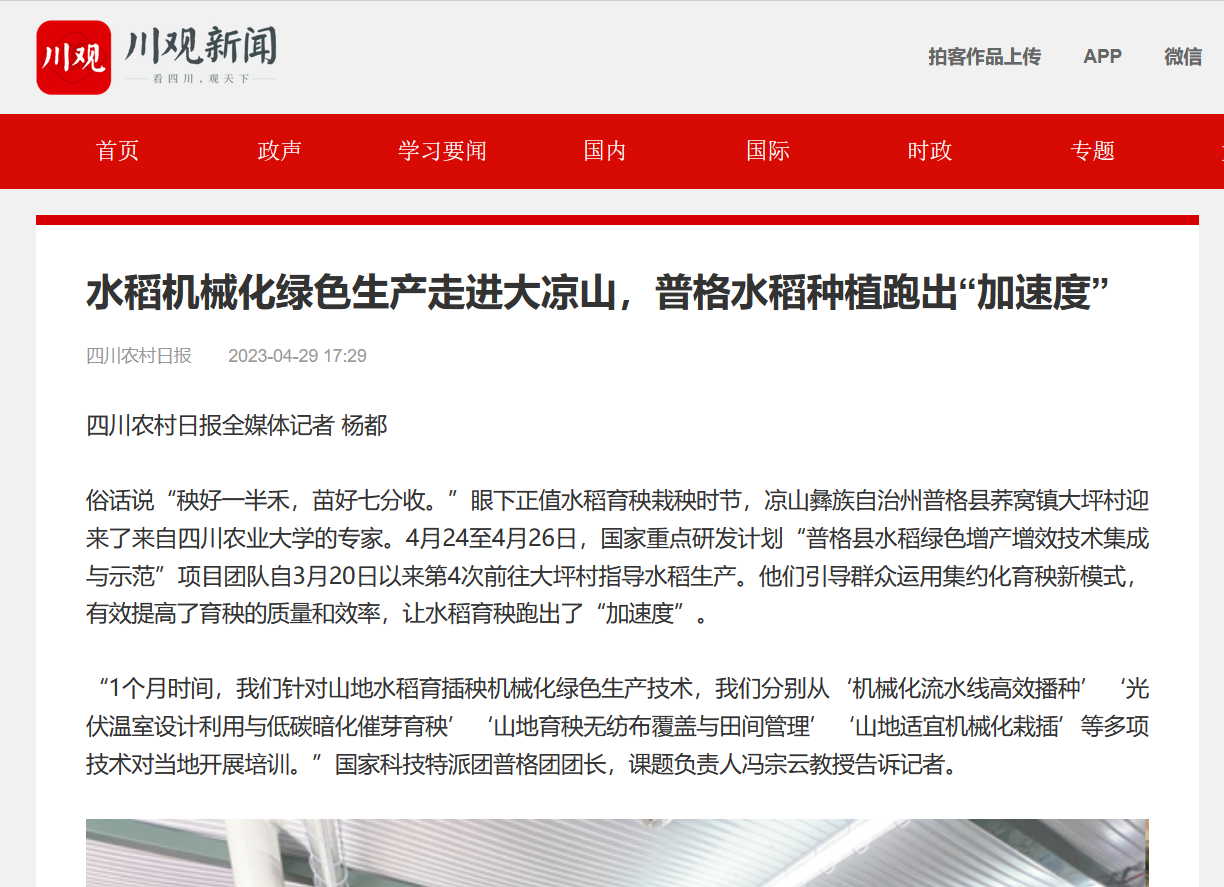 俗话说“秧好一半禾,苗好七分收。”眼下正值水稻育秧栽秧时节,凉山彝族自治州普格县荞窝镇大坪村迎来了来自36365线路检测中心no1的专家。4月24至4月26日,国家重点研发计划“普格县水稻绿色增产增效技术集成与示范”项目团队自3月20日以来第4次前往大坪村指导水稻生产。他们引导群众运用集约化育秧新模式,有效提高了育秧的质量和效率,让水稻育秧跑出了“加速度”。“1个月时间,我们针对山地水稻育插秧机械化绿色生产技术,我们分别从‘机械化流水线高效播种’‘光伏温室设计利用与低碳暗化催芽育秧’‘山地育秧无纺布覆盖与田间管理’‘山地适宜机械化栽插’等多项技术对当地开展培训。”国家科技特派团普格团团长,课题负责人冯宗云教授告诉记者。