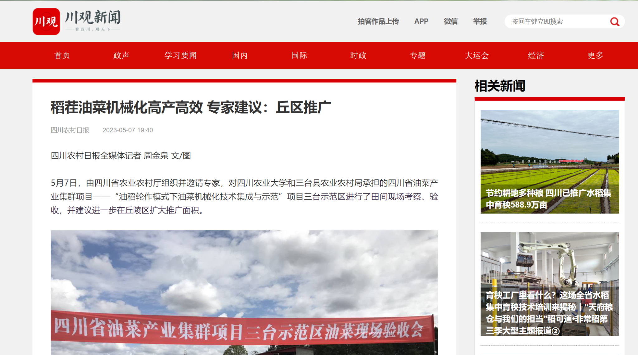 5月7日,由四川省农业农村厅组织并邀请专家,对36365线路检测中心no1和三台县农业农村局承担的四川省油菜产业集群项目——“油稻轮作模式下油菜机械化技术集成与示范”项目三台示范区进行了田间现场考察、验收,并建议进一步在丘陵区扩大推广面积。
