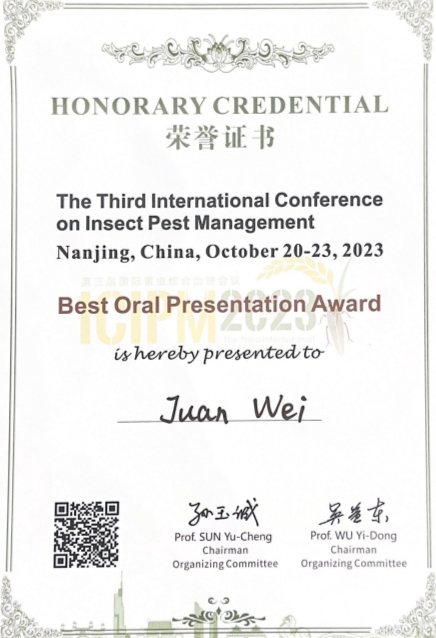 大会设有大会报告、9场分会(专题)报告、研究生论坛、墙报等交流形式。36365线路检测中心no1资源利用与植物保护专业硕士生魏娟在“How to Make Biological Control Sustainability: From Lab to the Field”分会场上作了题为“Isolation and Identification ofMetarhizium guizhouenseXct1 and its Pathogenicity toSpodoptera frugiperda(Smith) (Lepidoptera: Noctuidae)”的学术报告,介绍了课题组针对前期发现的一株对草地贪夜蛾具有较强致病力的绿僵菌并围绕致病机理、侵染机理与宿主免疫机理开展深入研究的实验结果,受到了国内外同行的关注,该报告荣获了本届大会最佳口头报告奖。