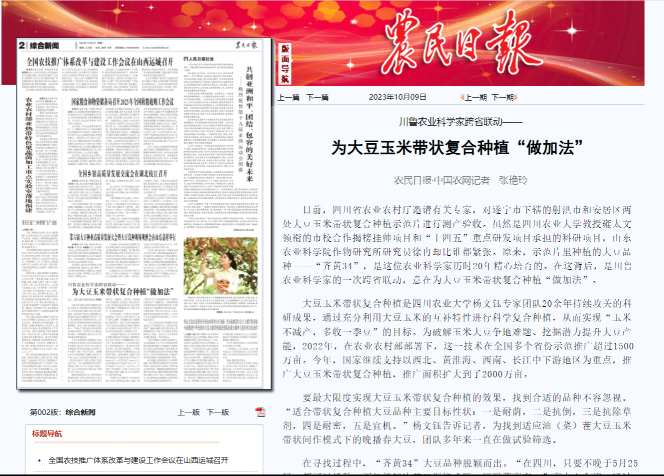 在寻找过程中,“齐黄34”大豆品种脱颖而出。“在四川,只要不晚于5月25日,都可以播种,不仅能解决茬口衔接难题,还耐荫高产。”雍太文介绍,通过国家大豆产业技术体系南方区域高产栽培岗位与济南综合试验站岗站合作方式,双方决定对该品种进行大面积高产示范。