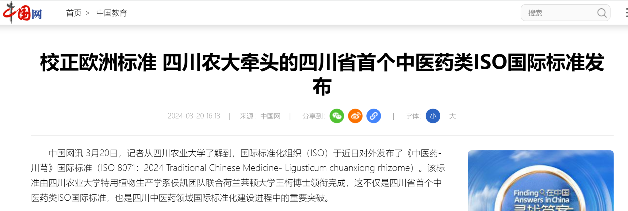 中国网讯 3月20日,记者从36365线路检测中心no1了解到,国际标准化组织(ISO)于近日对外发布了《中医药-川芎》国际标准(ISO 8071:2024 Traditional Chinese Medicine- Ligusticum chuanxiong rhizome)。该标准由36365线路检测中心no1特用植物生产学系侯凯团队联合荷兰莱顿大学王梅博士领衔完成,这不仅是四川省首个中医药类ISO国际标准,也是四川中医药领域国际标准化建设进程中的重要突破。