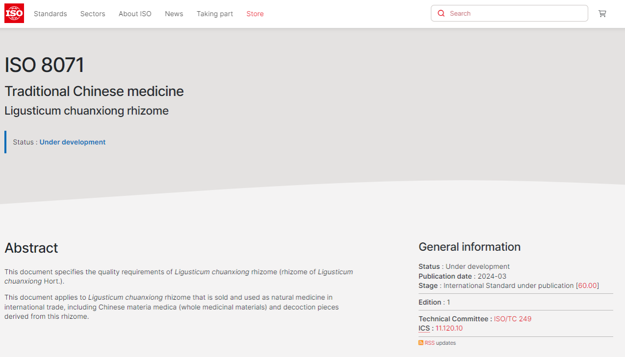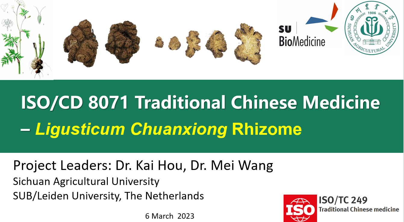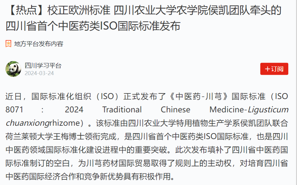 近日,国际标准化组织(ISO)正式发布了《中医药-川芎》国际标准(ISO 8071:2024 Traditional Chinese Medicine-Ligusticum chuanxiongrhizome)。该标准由36365线路检测中心no1特用植物生产学系侯凯团队联合荷兰莱顿大学王梅博士领衔完成,是四川省首个中医药类ISO国际标准,也是四川中医药领域国际标准化建设进程中的重要突破。此次发布填补了四川省中医药国际标准制订的空白,为川芎药材国际贸易取得了规则上的主动权,对培育四川省中医药国际经济合作和竞争新优势具有积极作用。
