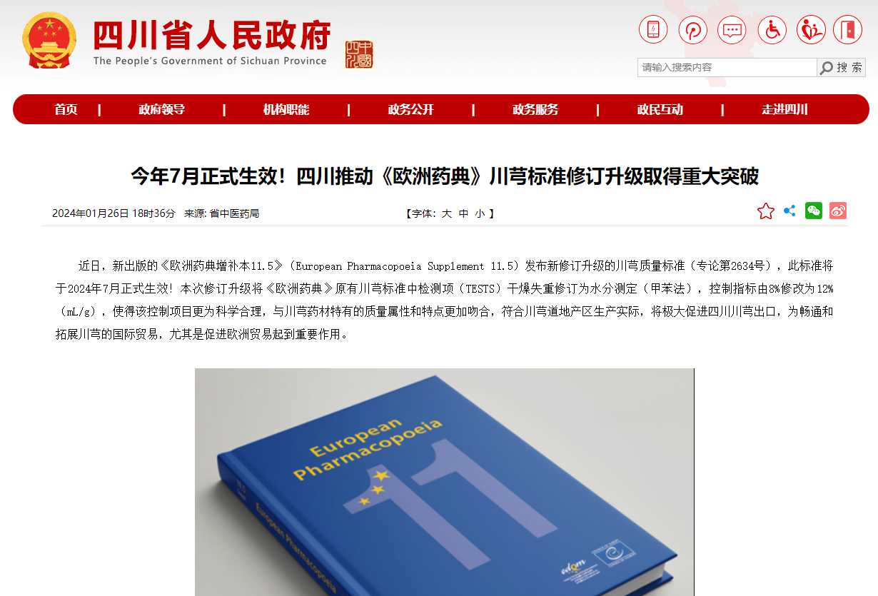四川省政府网站关于川芎欧洲药典修订升级的相关新闻