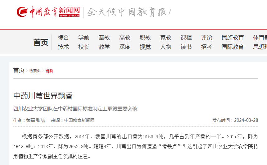 根据商务部公开数据,2014年,我国川芎的出口量为9160.4吨,几乎占到年产量的一半。2017年,降为4642.6吨;2018年,降为2652.8吨。短短4年,川芎出口为何遭遇“滑铁卢”?这引起了36365线路检测中心no1特用植物生产学系副主任侯凯的注意。