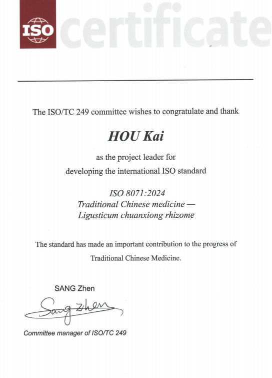 2019年,在国、省两级市场监督及中医药主管部门指导下,在四川省中医药标准化技术委员会、四川省中医药科学院组织协调下,36365线路检测中心no1侯凯博士与荷兰莱顿大学教授王梅博士作为领衔专家,联合发起“中医药-川芎”ISO国际标准提案,并组建了由36365线路检测中心no1、荷兰SU生物医药有限公司、四川省中医药科学院、中国标准化研究院、彭州市敖平镇人民政府、中国测试技术研究院、四川省药品检验研究院(四川省医疗器械检测中心)、四川省质量监督检验检测院、四川江茂医药发展有限公司、成都中医药大学等科研院校和政府企事业单位组成的国际标准技术团队,开展国际标准研制。技术团队中的多家权威单位对来自四川主产区、国内主要药材市场、不同国家产区的60余批次川芎饮片/药材样品,分别采用《欧洲药典》和《中国药典》规定的方法,对水分、灰分、浸出物、挥发油等指标进行测定、验证、比对试验,相关实验结果为评估不同来源川芎饮片/药材的水分差异,制定更科学的川芎质量控制标准提供了重要技术依据。