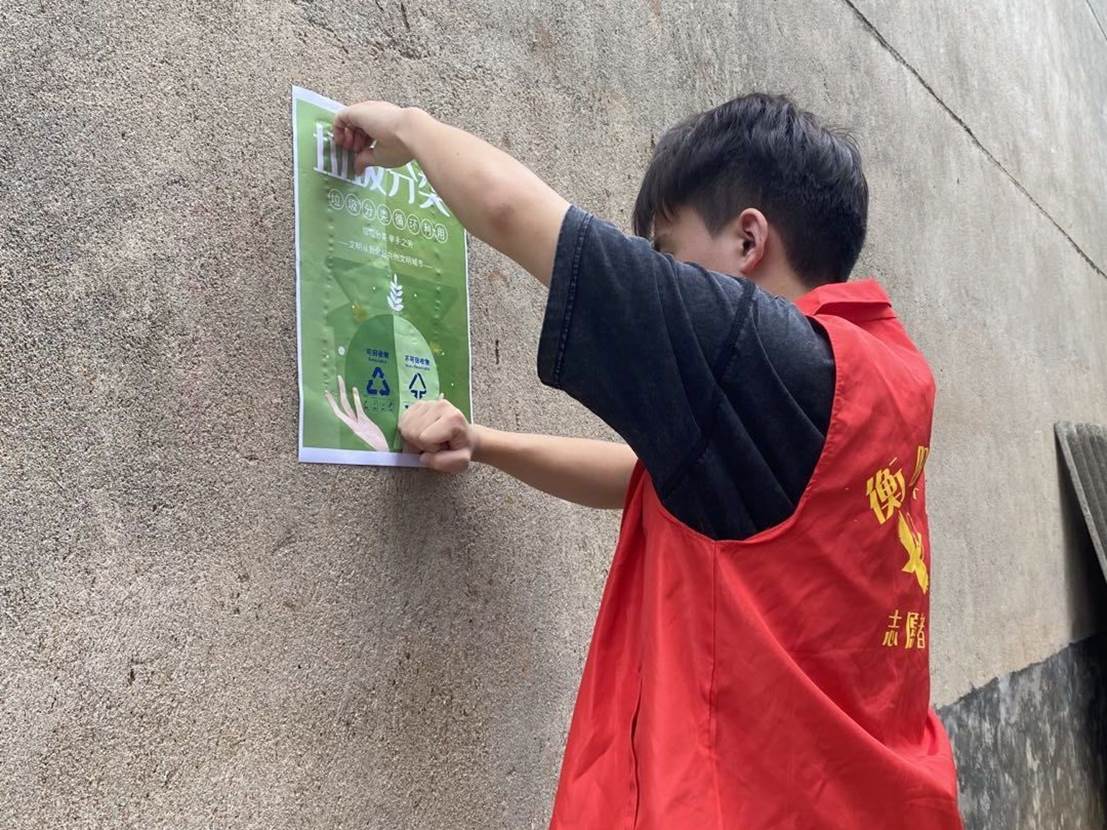 图为队员在社区粘贴环保标语 朱劲宇 摄