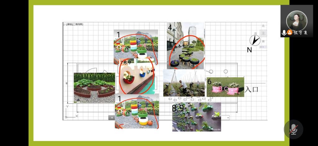 因受疫情影响,“不一样的生态农业”团队主要在线上以共同讨论的方式完成绿化改造的图纸方案设计。在队长及小组负责人的组织下,大家在线上畅所欲言,纷纷提出各自的创意想法,提供众多可能的方案设计,逐渐确定了划分好各个种植板块的初步设计。随后,团队利用课堂所学知识将每个板块种植什么品种的植物以及如何种植确定好。经过一个周左右的激烈讨论,在小组成员一次又一次修改与完善后,最终汇总出了令大家满意的方案设计图纸,其中包括了对简易植物乘凉爬架、轮胎休息座椅等设施的构思和设想,运用废物利用等理念进行改造,彰显绿色环保的理念。