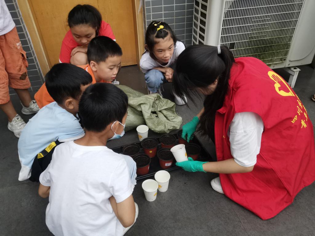 近年来随着科学技术的不断发展,大学生及社会人士就业压力越来越大,现代社会大部分家庭都在从小培养孩子的兴趣爱好,政府、村社也在为之做出努力。在2020年高山村花样少年第三季“健康少年,安全自我”暑期培训班为期13天的培训里,川农学子有幸受邀参与此次活动,并且作为志愿者引导孩子们学习农业基础知识和基本操作。志愿者结合PPT内容向孩子们详细介绍了多种花卉的特性及其种植方法,并通过现场操作教学向孩子们展示种植技能,同时也告诉他们后期相关的管理注意事项。
