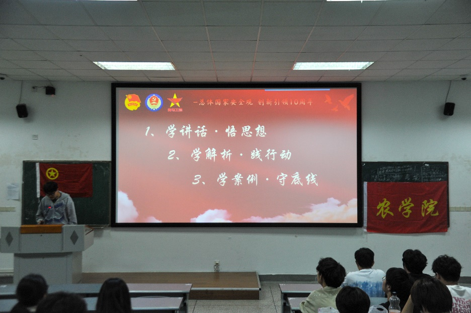 随后,智慧农业202301团支部的退役军人代表蓝艺同学分享了她在部队的生活经历和对国家安全的深刻感悟。她的事迹激发了同学们的爱国热情,增强了同学们对国家安全的责任感和使命感。活动进入高潮阶段,校青马班的李昊远和金鑫同学以国家安全为出发点,结合我校农林类高校特色,向同学们普及了威胁我国农业安全的因素及应对措施,进一步激发了同学们维护国家安全和农业安全的热情。