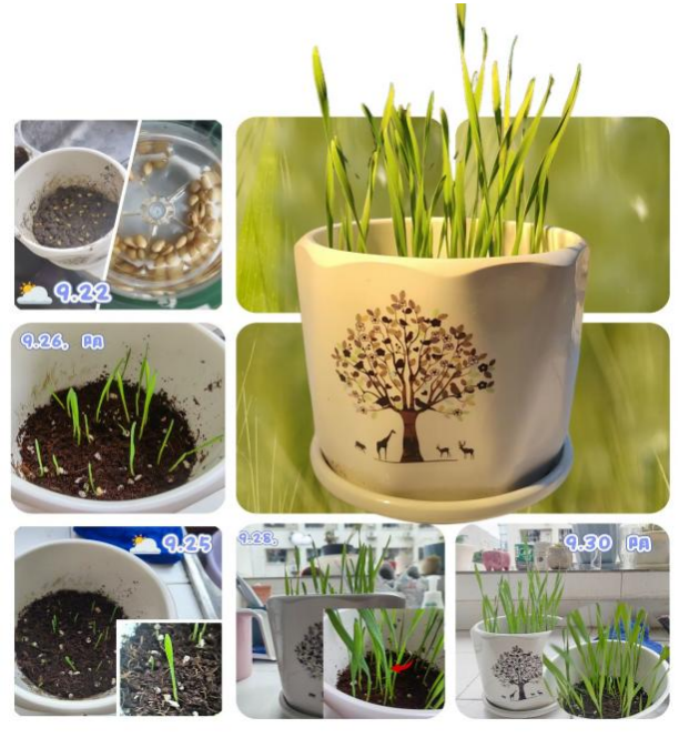 本次活动旨在深入贯彻习近平总书记“9·5 回信”精神,培养同学们的三农情怀,激发创新潜能。活动分为线上知识答题、线下种植体验和科普知识打卡三个部分。线上答题环节,同学们积极学习,在一道道题目中加深对“9·5 回信”精神、农业政策及农学知识的了解;线下种植体验活动中,同学们亲自动手,自行探索小麦的种植方法,记录小麦从发芽到成熟收获的种植过程;科普知识打卡则通过易班平台分享大家了解到的农业科技创新成果,在分享中增长知识、培养三农情怀。